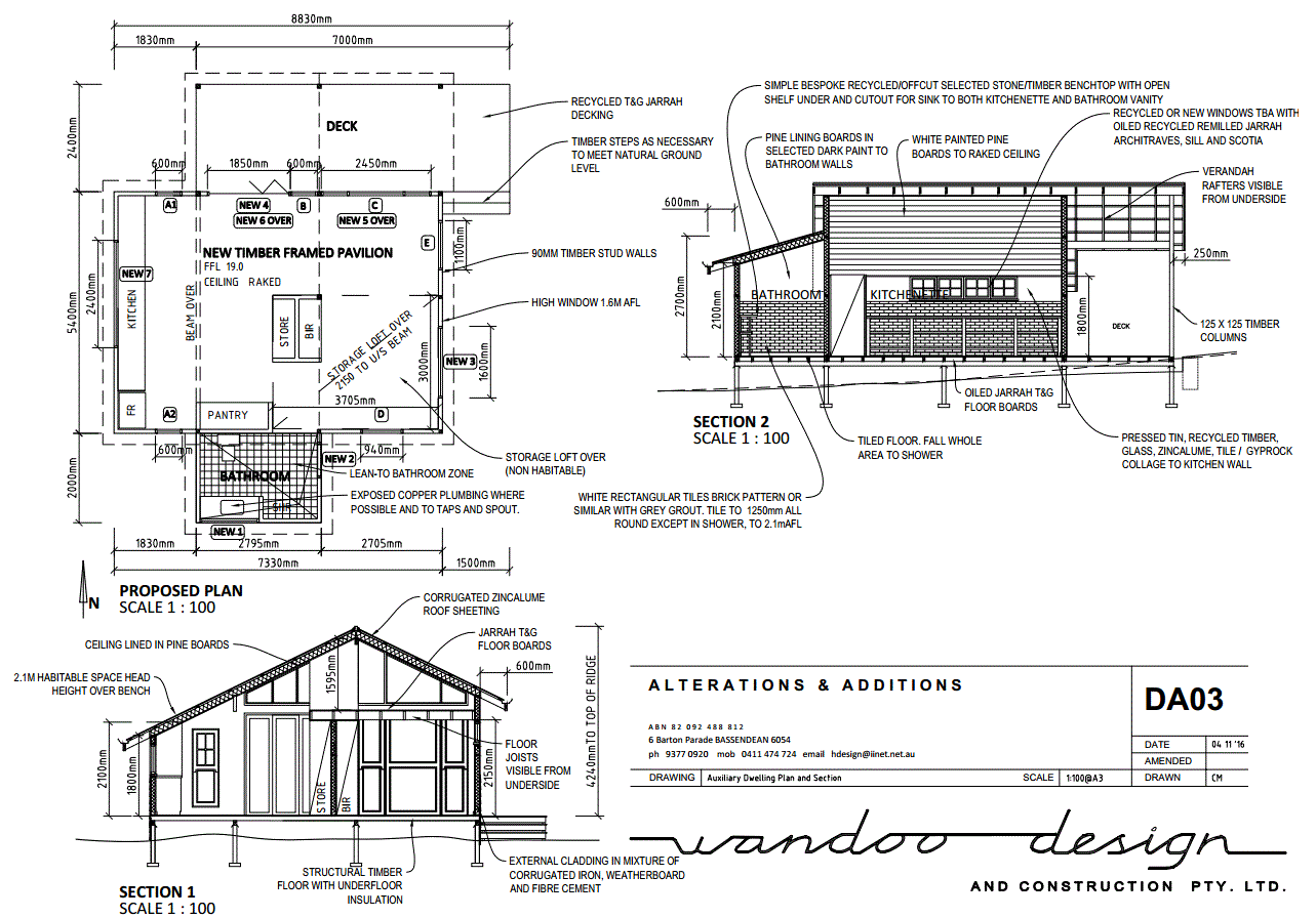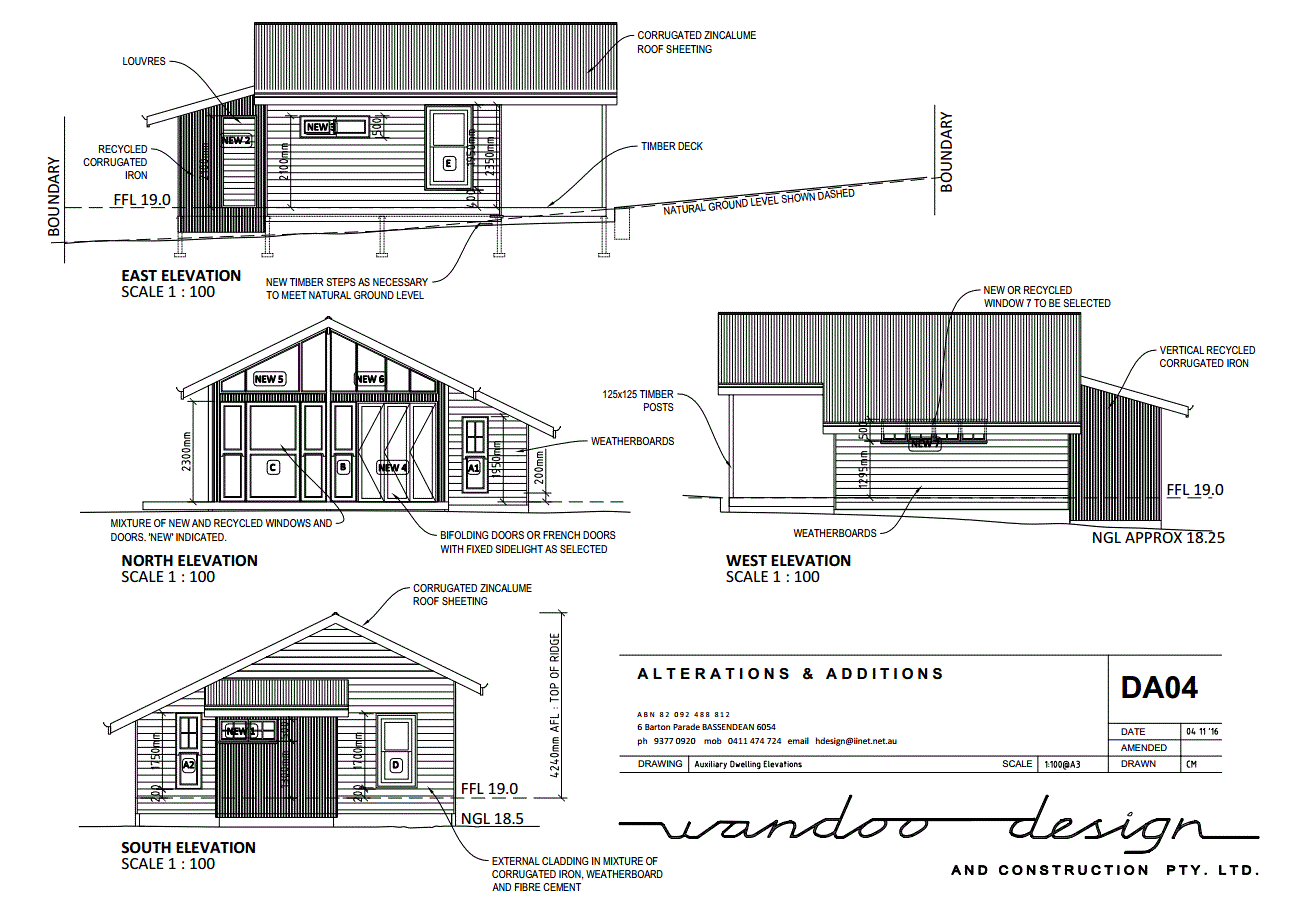 2020 Hilton Passive solar Granny Flat / Low Footprint Pavilion amongst native trees Concept design, documents, approvals including extensive written support and justification for non-compliance with Local policy, achieving approval under delegated authority with City of Fremantle after a sitting of councillors, pre-certification and build 2020. See my writeup and drawings on builder’s website here.